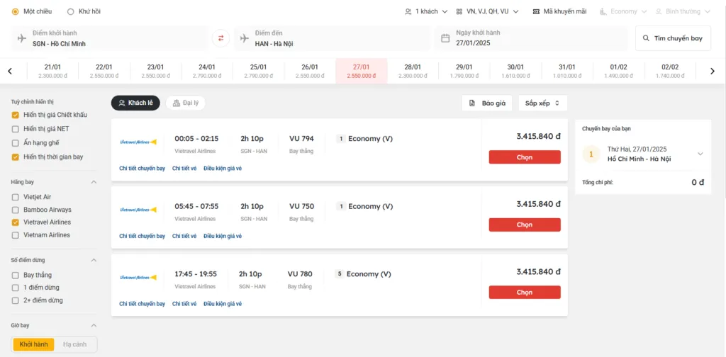 | Hồ Chí Minh – Hà Nội | Từ 3.465.840 VNĐ | Vietravel Airlines | 15/02/2026 |